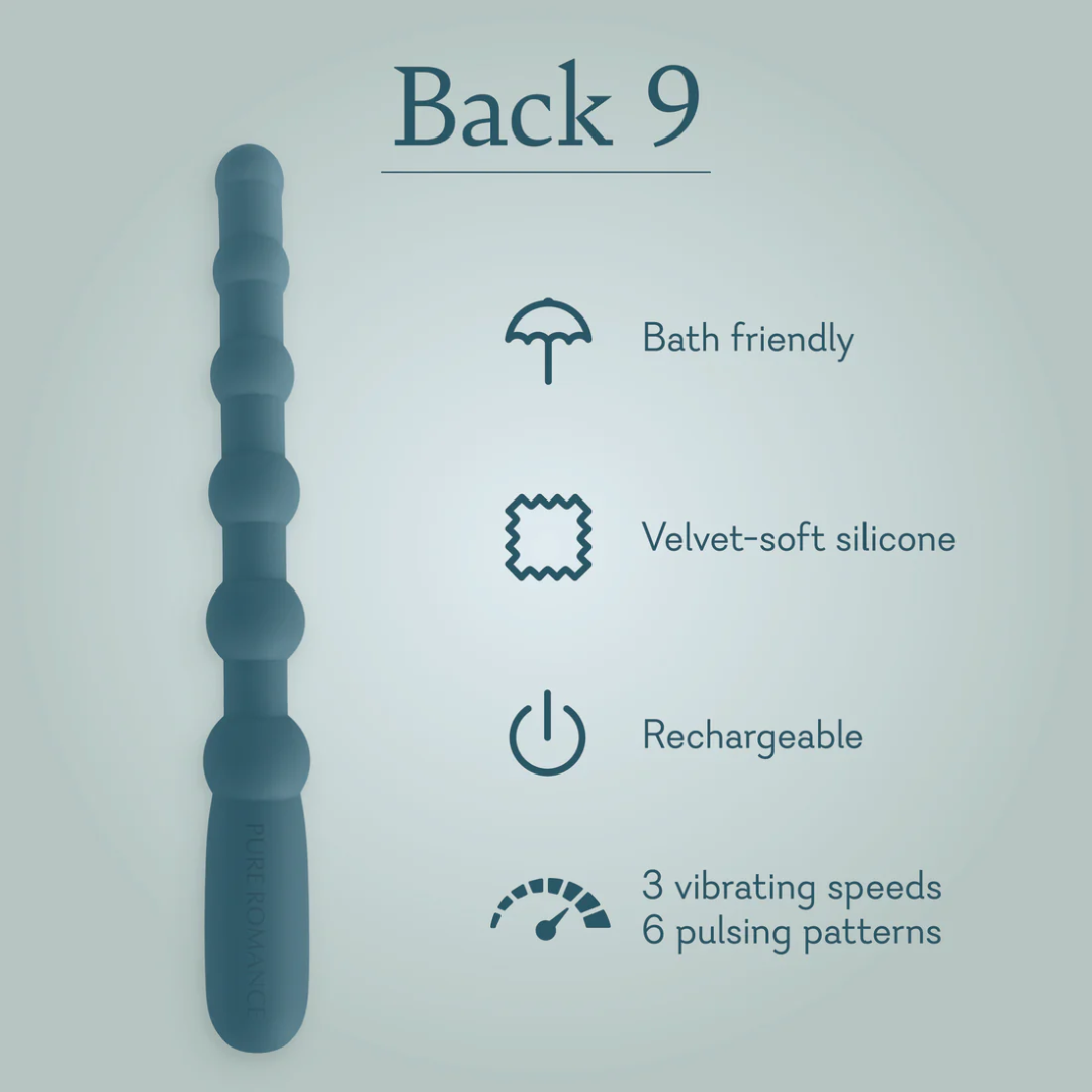 When it comes to the Back 9, nothing is out of bounds. This flexible silicone anal vibrator is always up to par with a series of graduated beads that let you indulge as little or as much as you want, while 9 powerful vibrating functions tee-up pleasure for the ultimate ace.