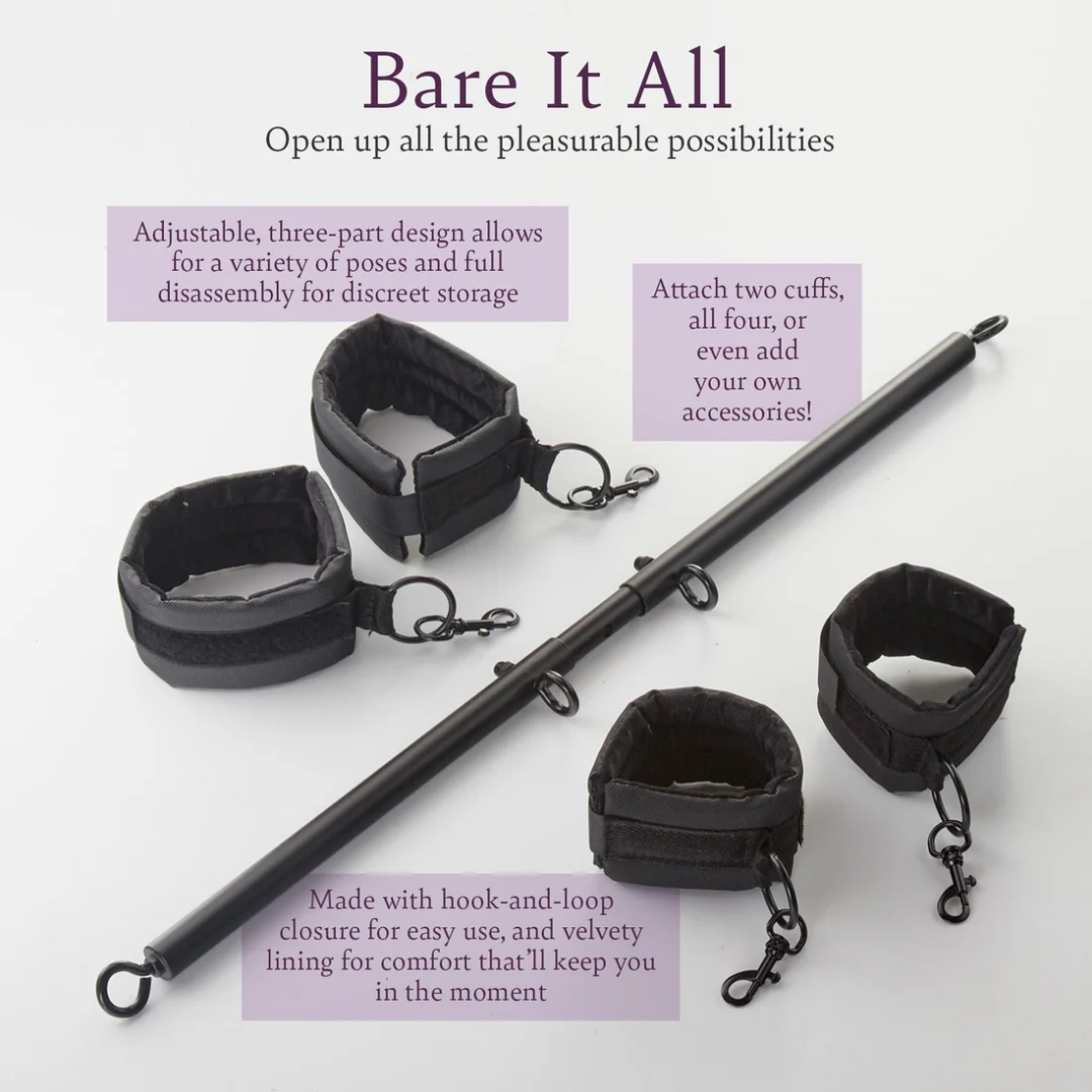 Submit to lust and bare it all with this spreader bar and cuff set. The four included cuffs and expandable bar allow for simple control or a variety of compromising positions.