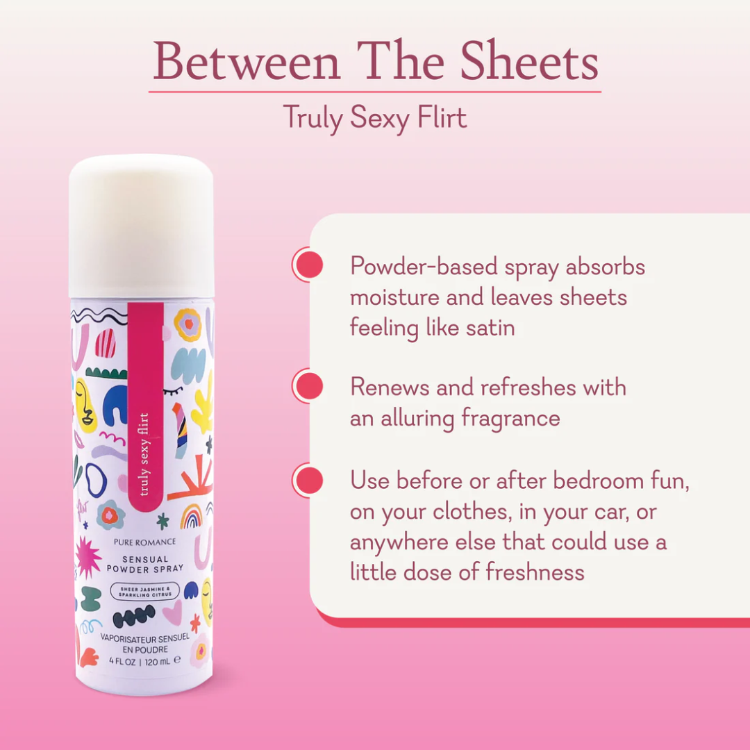 There's no denying that fresh is sexy. Between the Sheets is a powder-based linen spray that adds an alluring fragrance anywhere you spray it! After little fun in the bedroom, use a spritz or two to absorb moisture and make your sheets feel just like satin and put an end to the dreaded wet spot! Flirt scent is a bouquet of sheer jasmine, sparkling lemon, and clean amber.