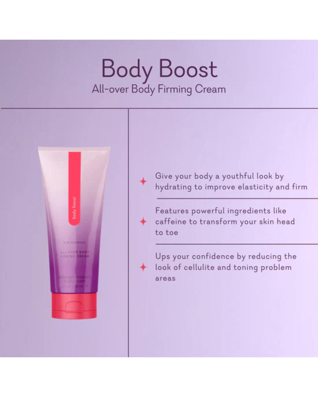 Ready to defy gravity? Body Boost helps give your body a youthful look by hydrating to improve elasticity and firm. This all-over cream features powerful ingredients like caffeine to transform your skin. Try it on cellulite, stretch marks, and other spots. For all-over body hydration and firming, massage into skin in a circular motion twice a day.