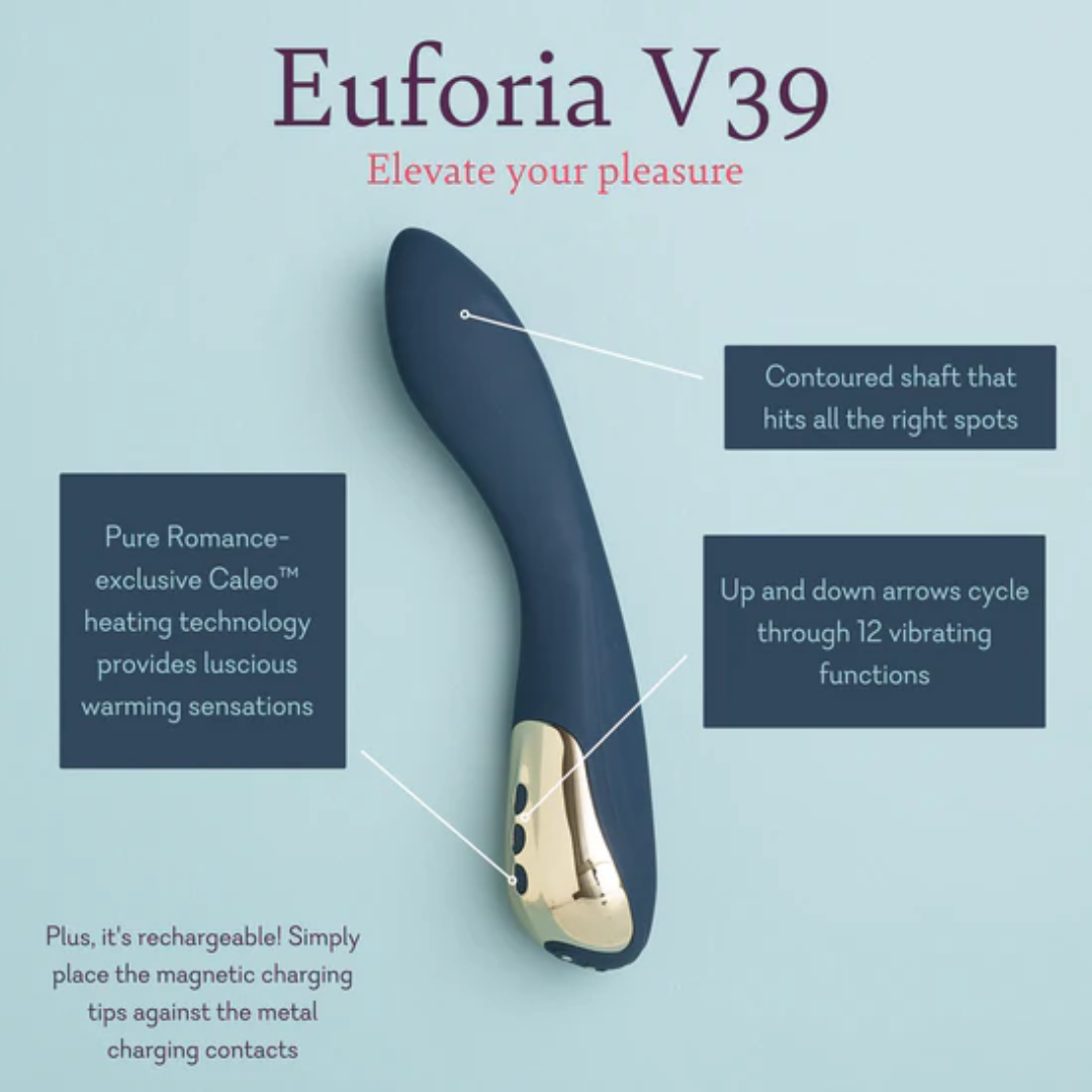 Experience premium, heated pleasure with the Euforia V39 Vaginal Vibrator. Just like the rest of our Euforia Products, the V39 delivers the best in quality and features. The perfectly contoured shaft is coated in silky soft silicone, while the beautiful 18-karat gold plate brings you to a new level of luxurious bliss. Enjoy three breathtaking speeds and nine pulsing patterns. And when you’re ready to turn up the heat, Caleo™ technology delivers tantalizing warmth. Enjoy in the bedroom or the bath for an exceptional pleasure experience.